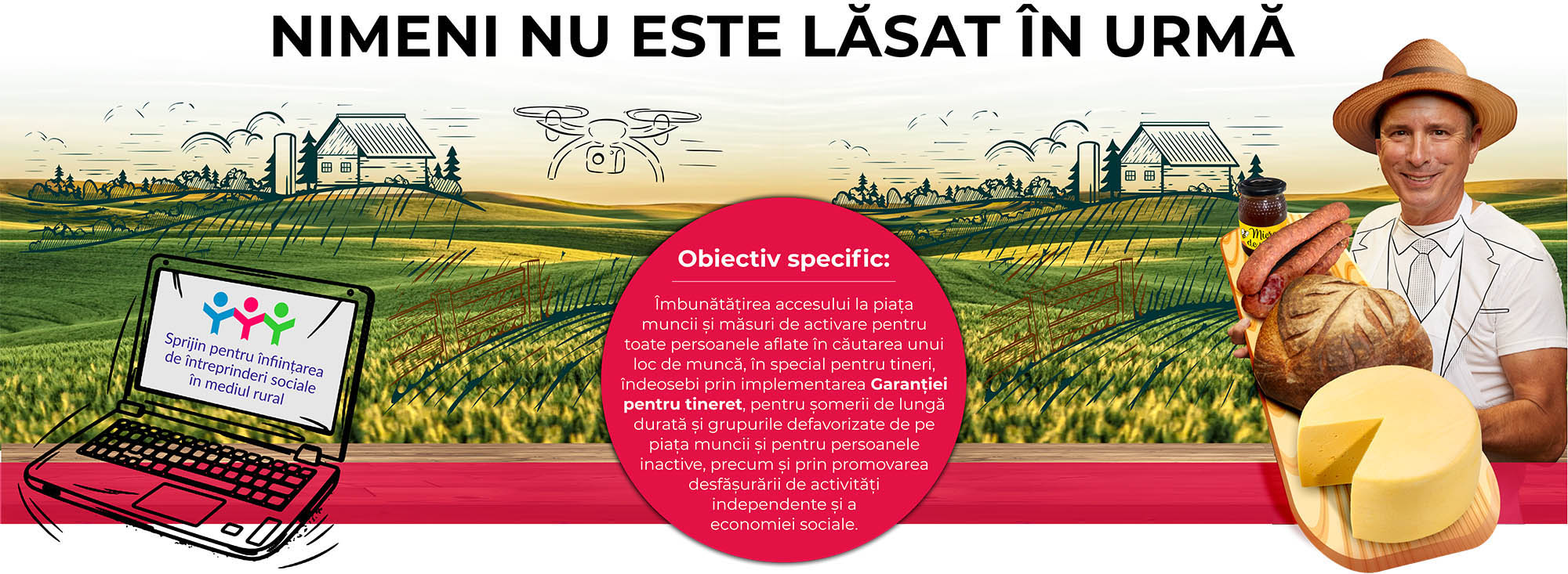 ”Susținerea demersurilor (inițiativelor) în domeniul antreprenoriatului social în mediul rural din Regiunile Centru și Nord-Vest, prin furnizarea serviciilor de formare și consiliere antreprenorială, pentru GT – 135 persoane cu domiciliul în mediu rural, din care minim 21 persoane romi, minim 27 persoane din GT persoane vulnerabile, precum și prin acordarea ajutorului de minimis necesar pentru înființarea a 34 întreprinderi de economie socială care să funcționeze într-o maniera auto-sustenabilă, în cadrul cărora vor fi create și ocupate 136 locuri de muncă, din care participanți care au un loc de muncă, inclusiv care desfășoară o activitate independentă, la încetarea calității de participant – persoane vulnerabile din mediul rural – 42 (persoane dezavantajate/ defavorizate pe piața muncii, șomeri, persoane inactive), intervenție materializată pe perioada a 30 luni”.